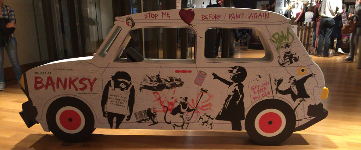 写真撮影を楽しんでいたフロアーのすぐ横にある、らせん階段を下に降りていくと、一目見てすぐにバンクシーとわかるステンシルアートたちで埋め尽くされている白い車が出迎えてくれます。